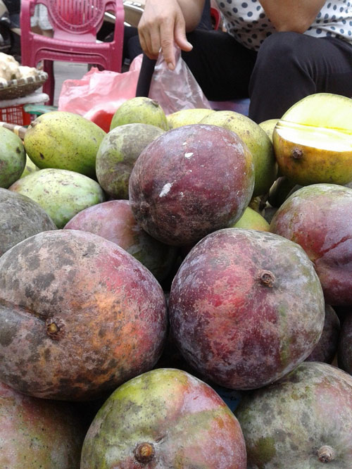 Quả xoài tím được bán tại chợ Nghĩa Tân (Cầu Giấy), một nửa vỏ đã chuyển sang màu tím. Ảnh: Nông Thuyết