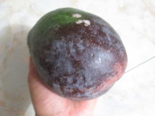 Theo ghi nhận của PV, loại xoài này đúng là có vỏ màu tím, quả khá tròn và to. Khi ăn xanh sẽ giòn và có vị giống xoài Thái.