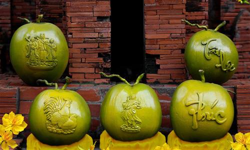 Dù có giá khá cao nhưng dừa in hình gà, Phúc - Lộc - Thọ, Quan âm Bồ tát... vẫn đang được thị trường Tết đón nhận tốt.